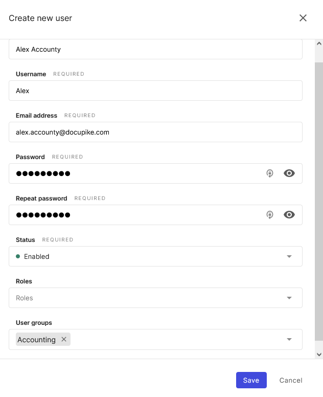 We switch to the Settings and create a new group named "Accounting" under User management -> User groups. Here we will later add all users who work in accounting.
