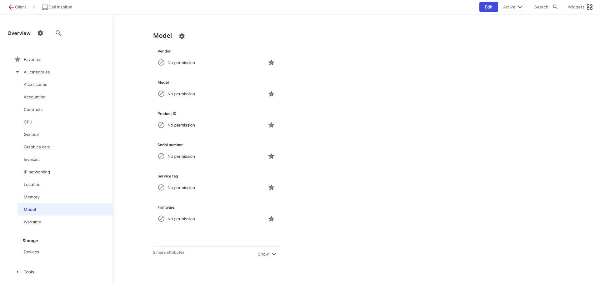 Our accounting department should have access to all assets, but only be able to see accounting data and the location of the devices. Editing by the accounting department should also only be possible in this category.